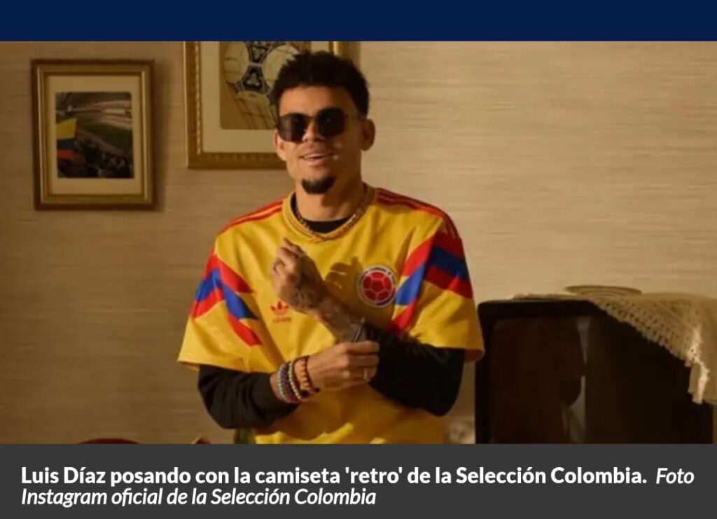 La prenda, presentada oficialmente a través de las plataformas digitales de la Federación Colombiana de Fútbol, reproduce el diseño del uniforme suplente que el equipo utilizó hace más de tres décadas. El encargado de lucirla en la campaña promocional fue el delantero Luis Díaz, figura actual del combinado nacional.
